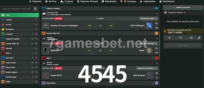 O 4545 oferece uma grande seleção de opções de apostas em e-sports com probabilidades competitivas